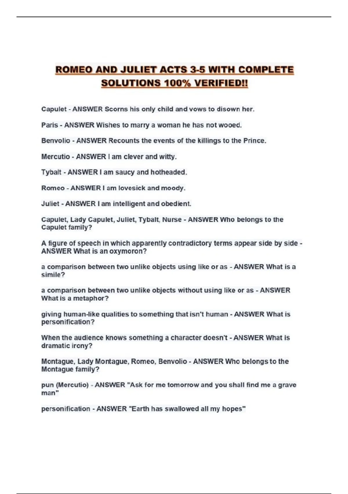 ROMEO AND JULIET ACTS 3-5 WITH COMPLETE SOLUTIONS 100% VERIFIED!!...