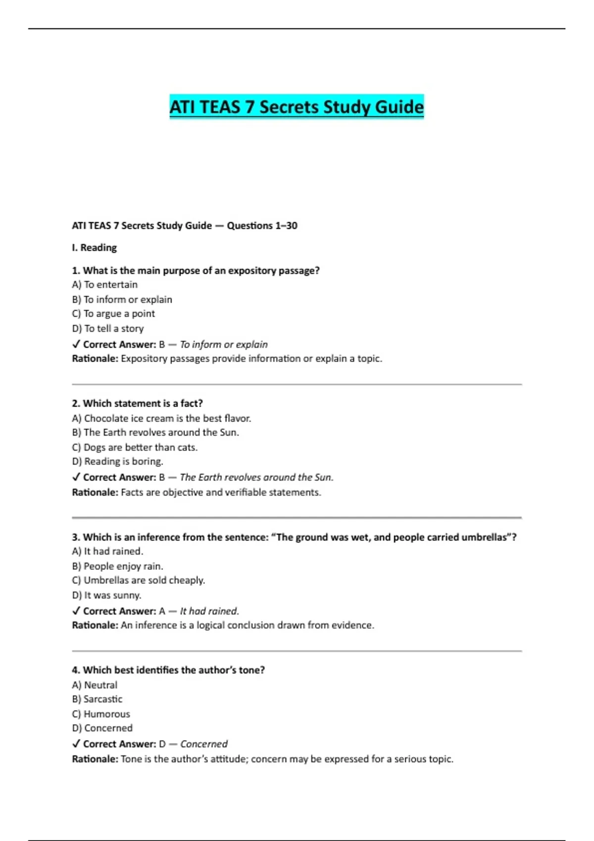 ATI TEAS 7 Secrets Study Guide — Questions 1–30