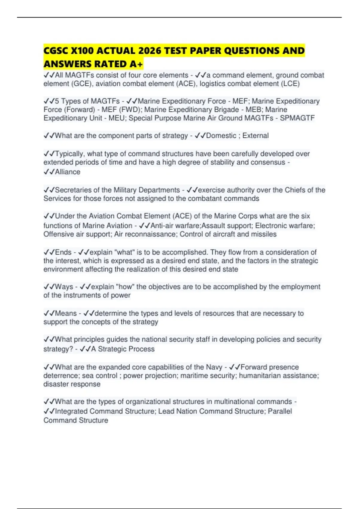 CGSC X100 ACTUAL 2026 TEST PAPER QUESTIONS AND ANSWERS RATED A+
