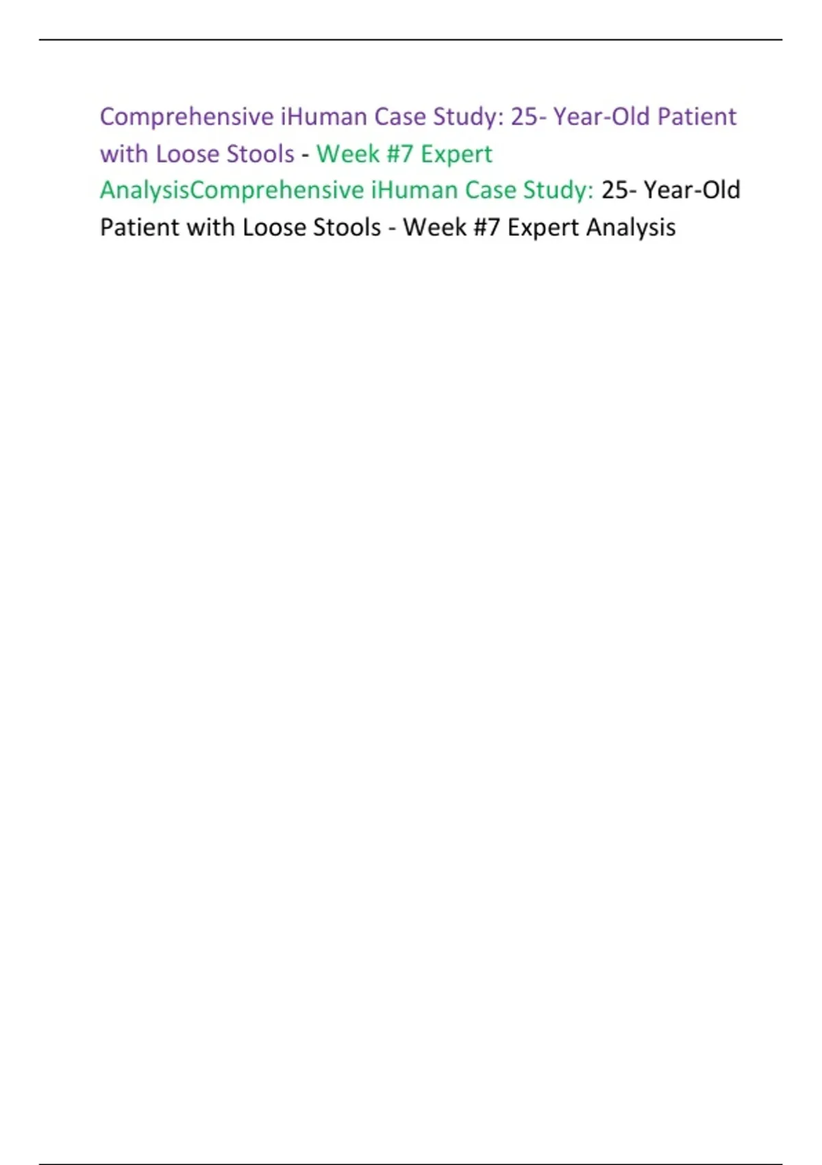 -human Case Study Week 7: Recurrent Loose Stools In A 25-year-old Adult Recurrent Loose Stools in a 25-Year-Old Adult Comprehensive i-Human Case Study – Week #7 Expert Analysis Patient Overview Age: 25 years Sex: Adult (gender not specified) Chief Complaint: Recurrent loose stools Case Context: i-Human Case Study – Week #7 Chief Complaint (CC) “Loose stools for several weeks.” History of Present Illness (HPI) The patient is a 25-year-old adult presenting with recurrent loose stools occurring multiple times daily for several weeks. The stools are described as loose to watery, non-bloody, and non-mucoid. Symptoms are intermittent but persistent, with episodes often occurring after meals. The patient reports associated abdominal cramping and bloating that improves after defecation.