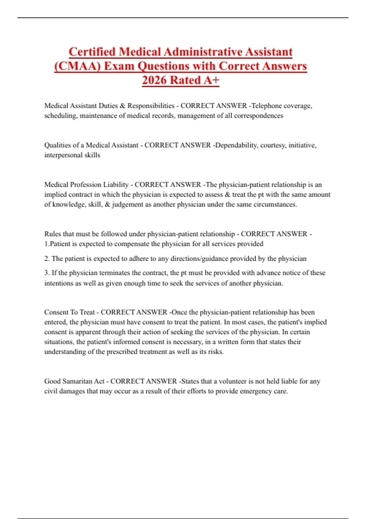 Certified Medical Administrative Assistant (CMAA) Exam Questions with Correct Answers 2026 Rated A+