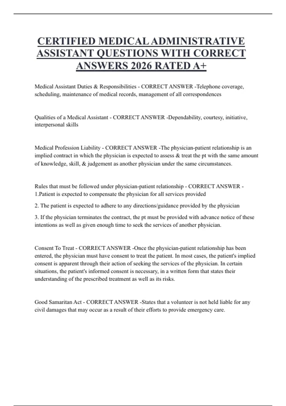 CERTIFIED MEDICAL ADMINISTRATIVE ASSISTANT QUESTIONS WITH CORRECT ANSWERS 2026 RATED A+