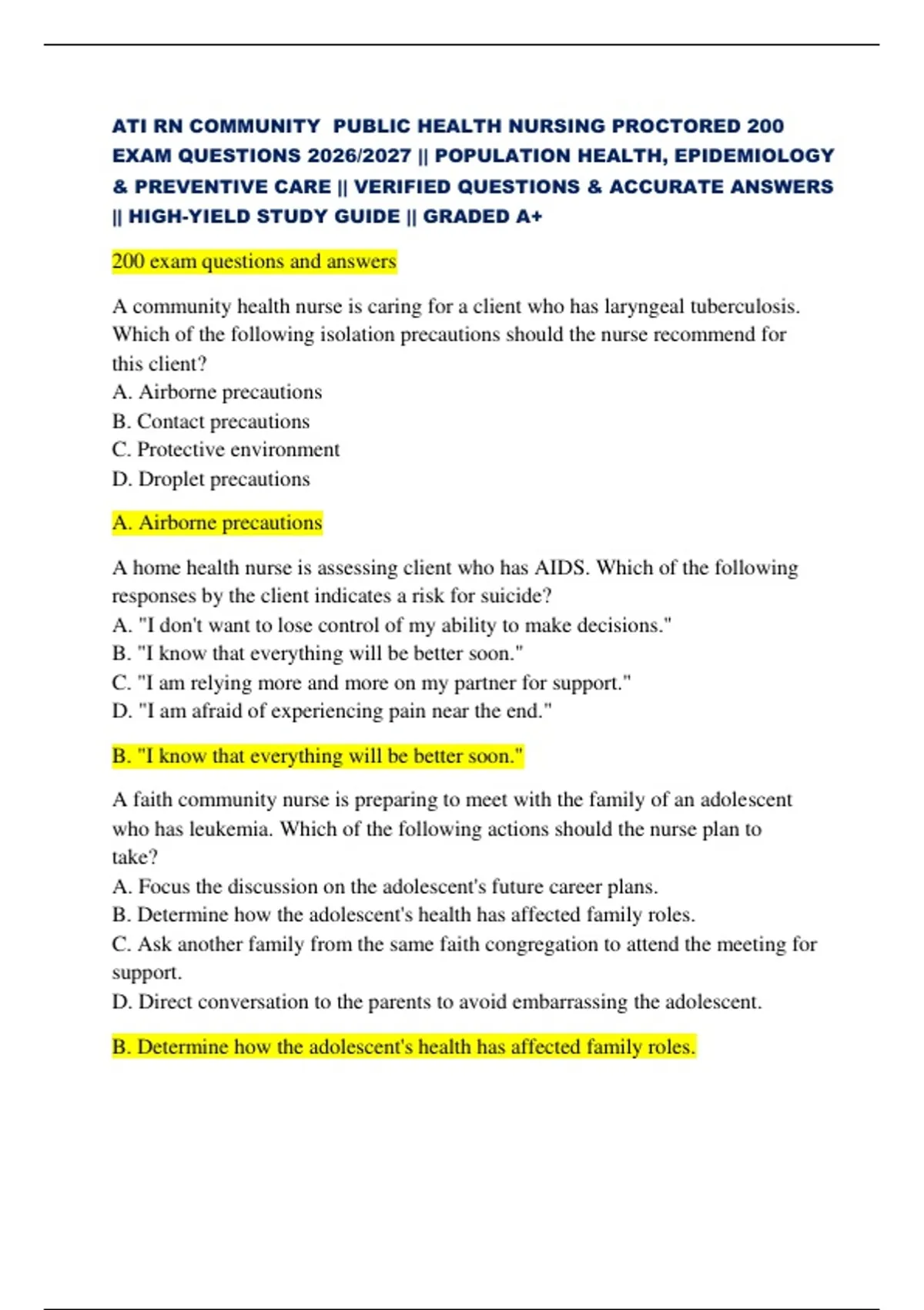 ATI RN COMMUNITY PUBLIC HEALTH NURSING PROCTORED 200 EXAM QUESTIONS 2026/2027 || POPULATION HEALTH, EPIDEMIOLOGY & PREVENTIVE CARE || VERIFIED QUESTIONS & ACCURATE ANSWERS || HIGH-YIELD STUDY GUIDE || GRADED A+ 200 exam questions and answers A community health nurse is caring for a client who has laryngeal tuberculosis. Which of the following isolation precautions should the nurse recommend for this client? A. Airborne precautions B. Contact precautions C. Protective environment D. Droplet precautions A. Airborne precautions