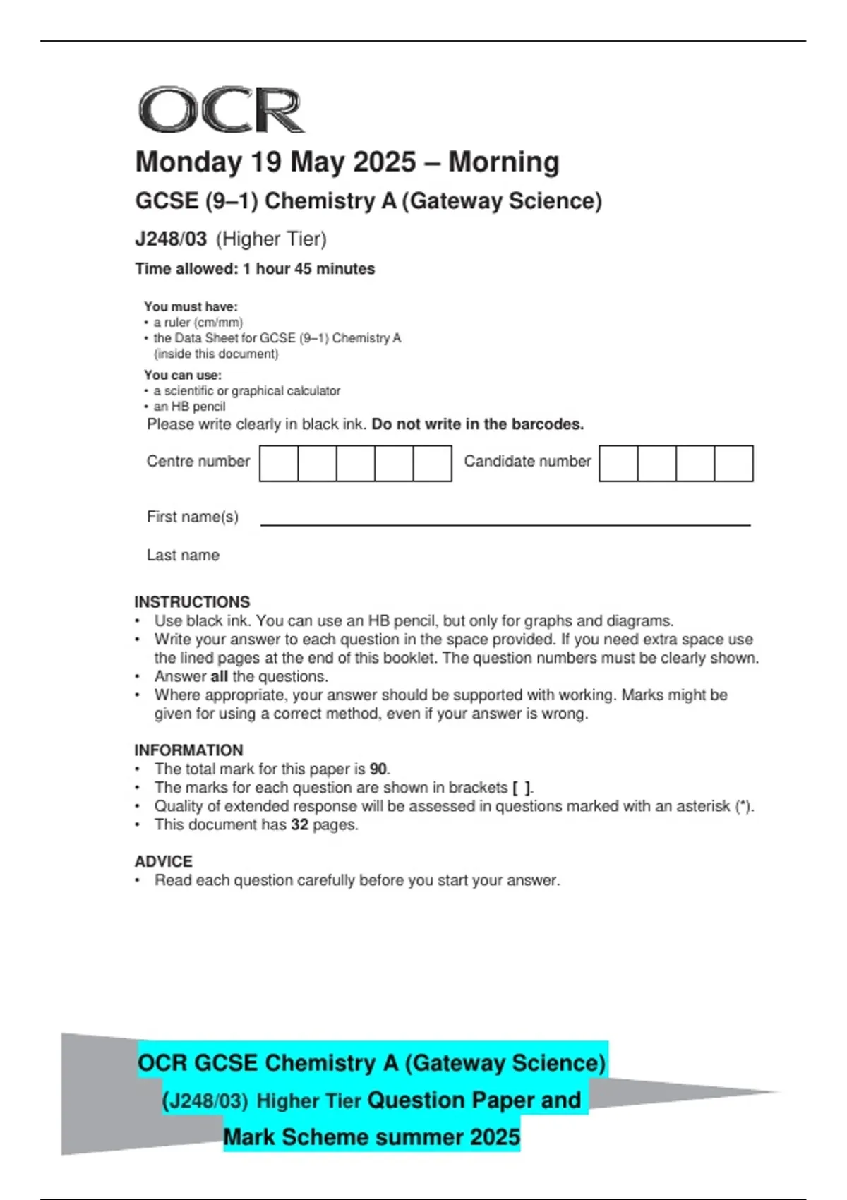 • the Data Sheet for GCSE (9–1) Chemistry A