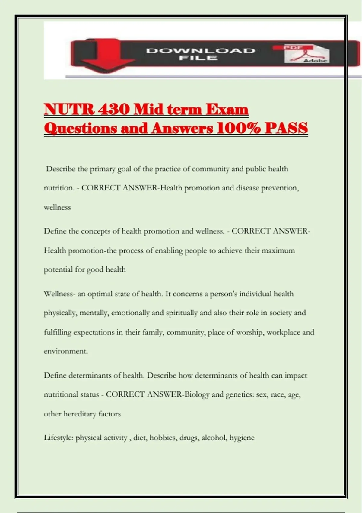 NUTR 430 Mid term Exam Questions and Answers 100% PASS