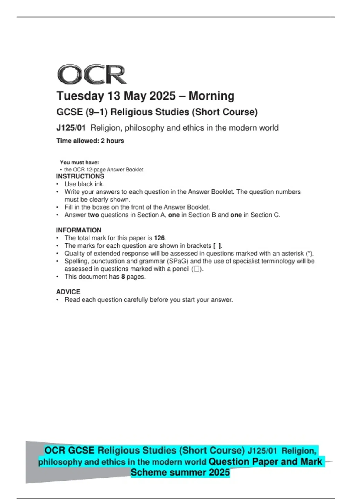 OCR GCSE Religious Studies (Short Course) J125/01 Religion,