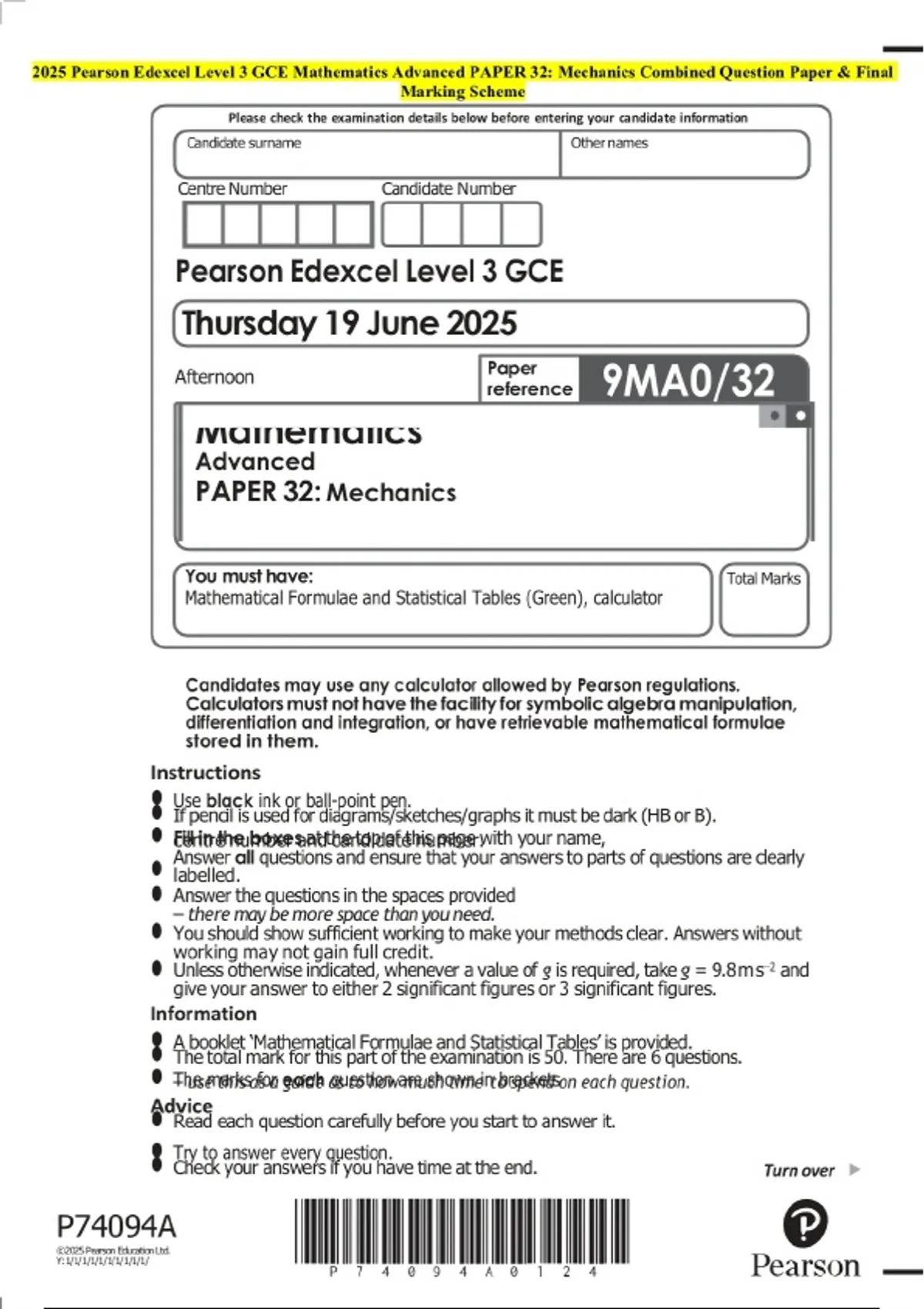 2025 Pearson Edexcel Level 3 GCE Mathematics Advanced PAPER 32: Mechanics Combined Question paper and approved marking scheme