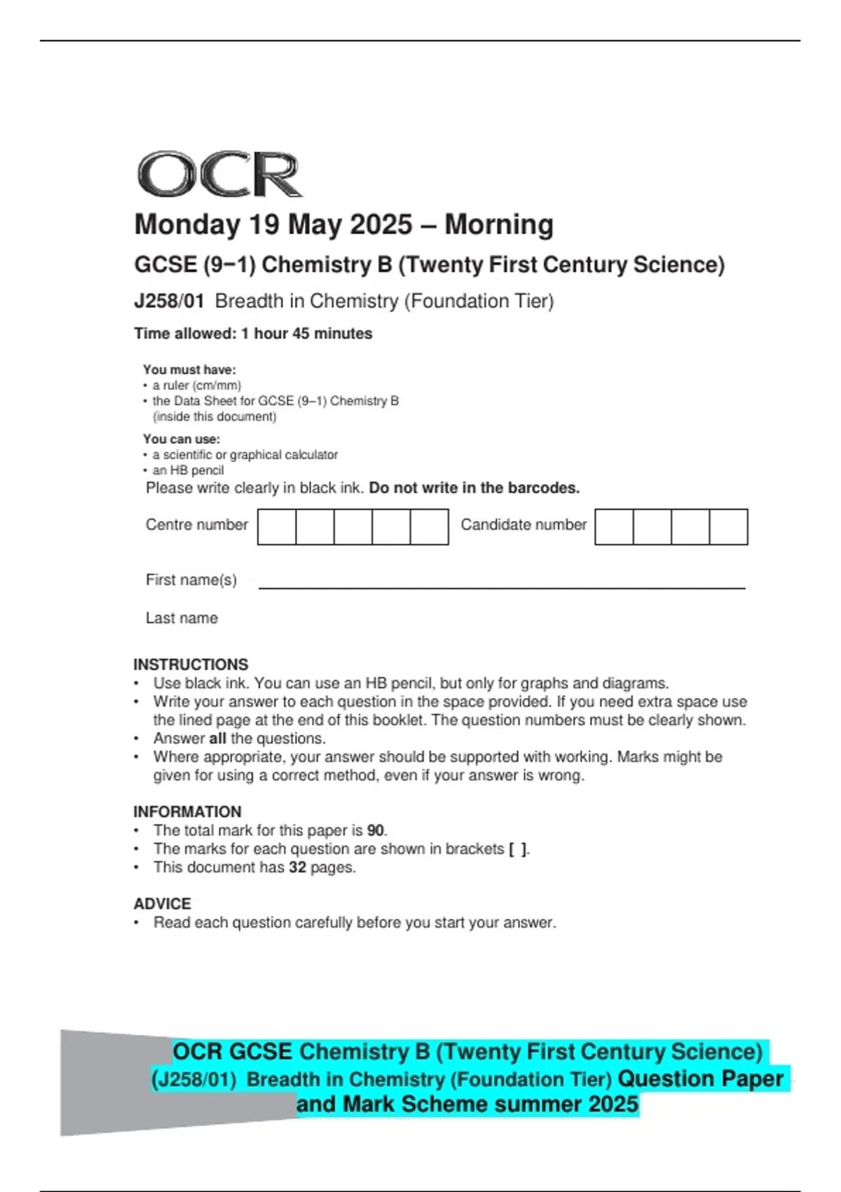 OCR GCSE Chemistry B (Twenty First Century Science) (J258/01) Breadth in Chemistry (Foundation Tier) Question Paper and Mark Scheme summer 2025