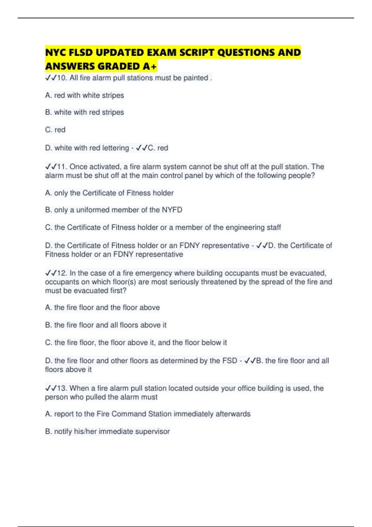 D. the fire floor and other floors as determined by the FSD - ✔✔B. the fire floor and all