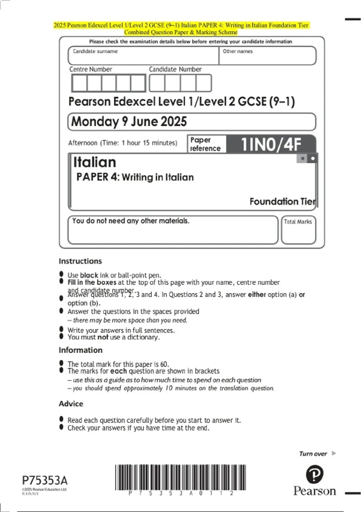 2025 Pearson Edexcel Level 1/Level 2 GCSE (9–1) Italian PAPER 4: Writing in Italian Foundation Tier Examination Paper and Final Marking Scheme