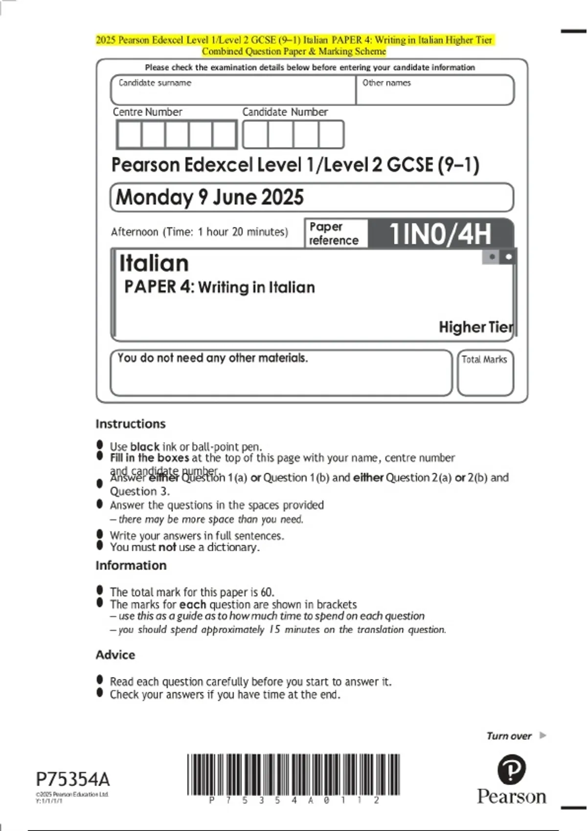 2025 Pearson Edexcel Level 1/Level 2 GCSE (9–1) Italian PAPER 4: Writing in Italian Higher Tier Examination Paper and Final Marking Scheme