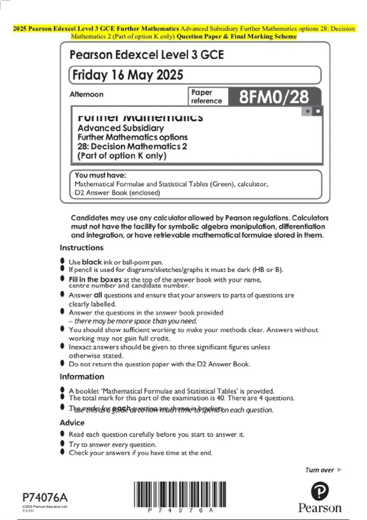 2025 Pearson Edexcel Level 3 GSCE Further Mathematics Advanced Subsidiary Further Mathematics options 28: Decision Mathematics 2 (Part of option K only Question paper and approved marking scheme)