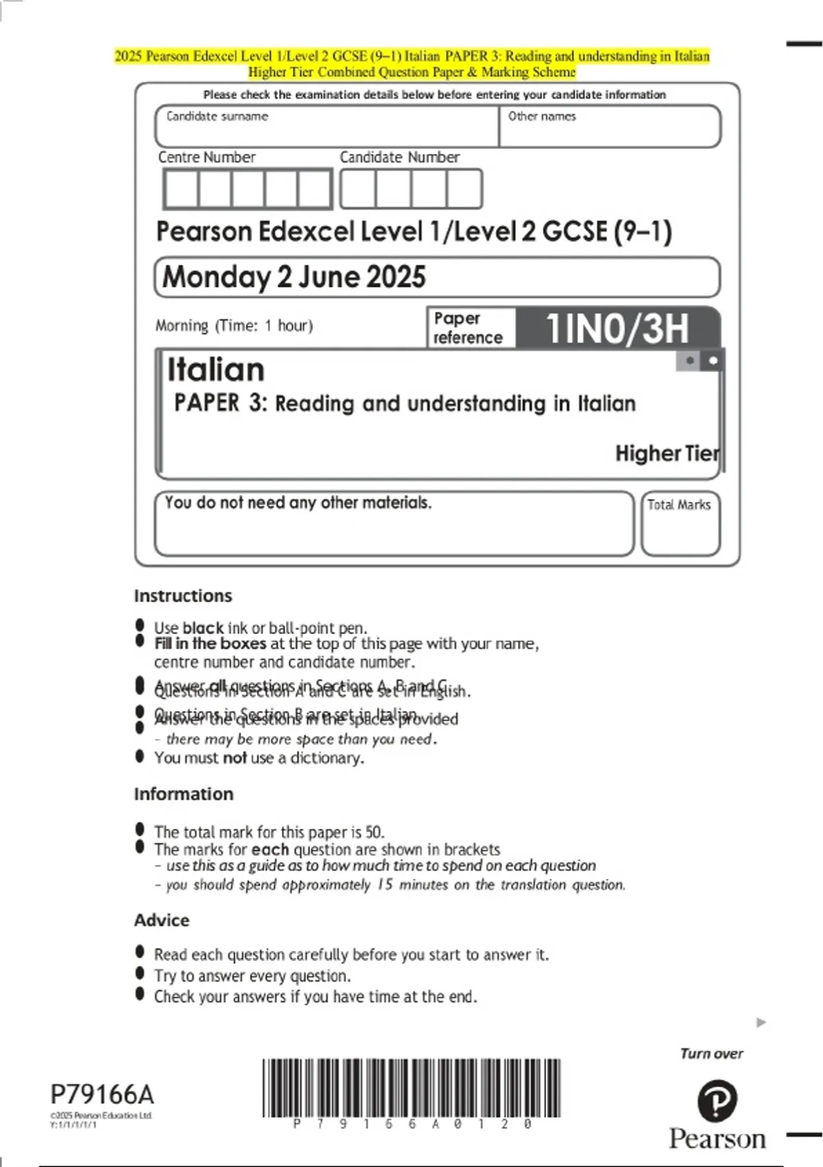 2025 Pearson Edexcel Level 1/Level 2 GCSE (9–1) Italian PAPER 3: Reading and understanding in Italian Higher Tier Examination Paper and Final Marking Scheme