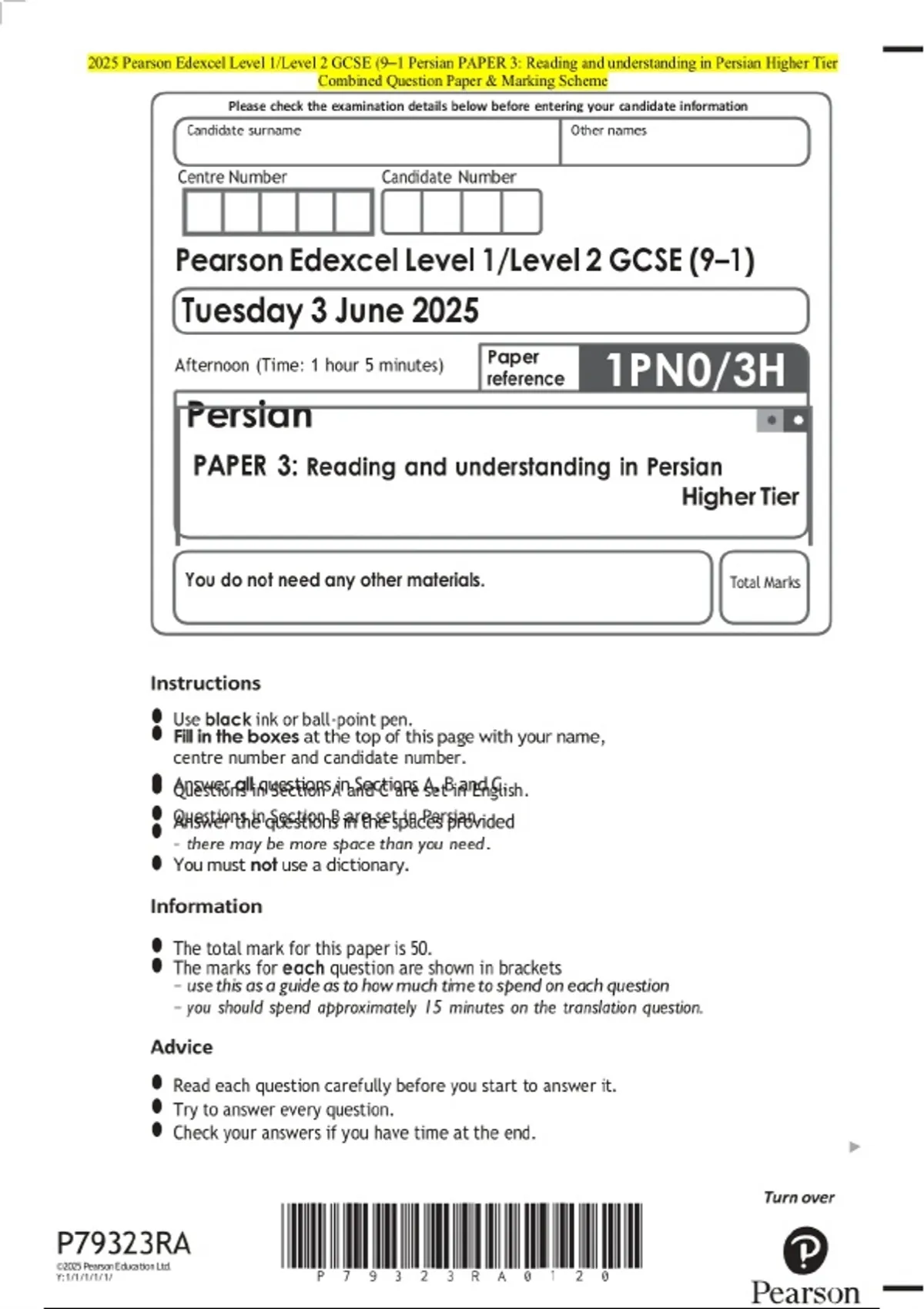2025 Pearson Edexcel Level 1/Level 2 GCSE (9–1 Persian PAPER 3: Reading and understanding in Persian Higher Tier Combined Question paper and approved marking scheme