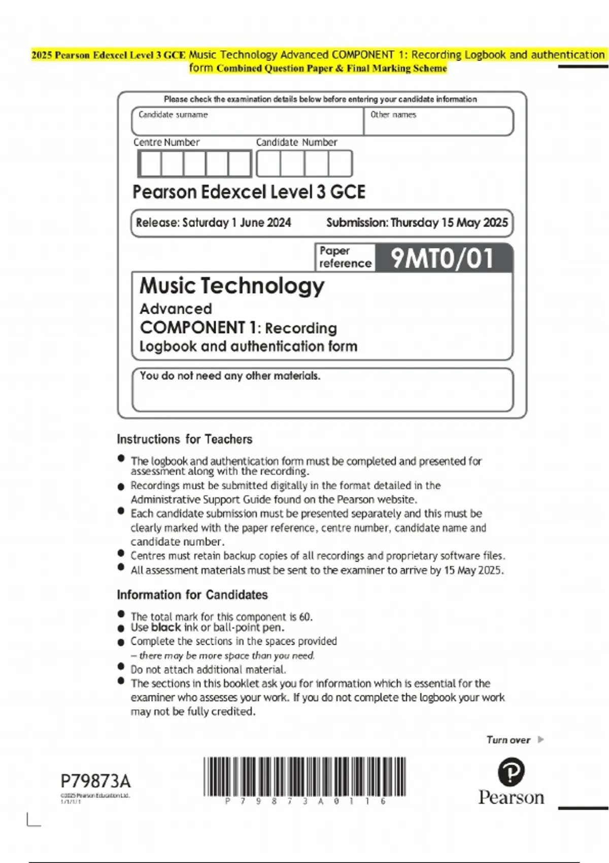 2025 Pearson Edexcel Level 3 GCE Music Technology Advanced COMPONENT 1: Recording Logbook and authentication form Examination Paper and Final Marking Scheme
