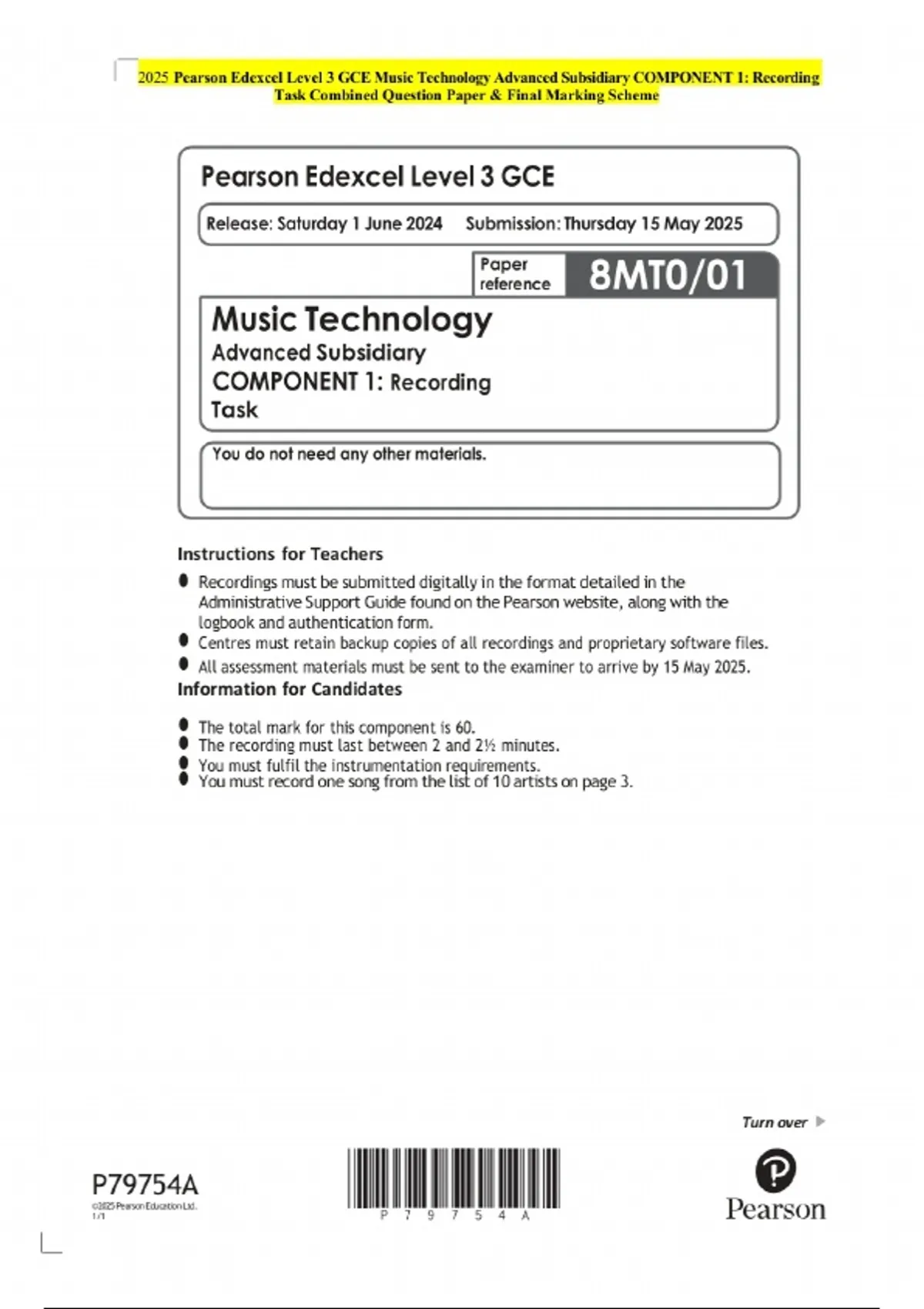 2025 Pearson Edexcel Level 3 GCE Music Technology Advanced Subsidiary COMPONENT 1: Recording Task Examination Paper and Final Marking Scheme