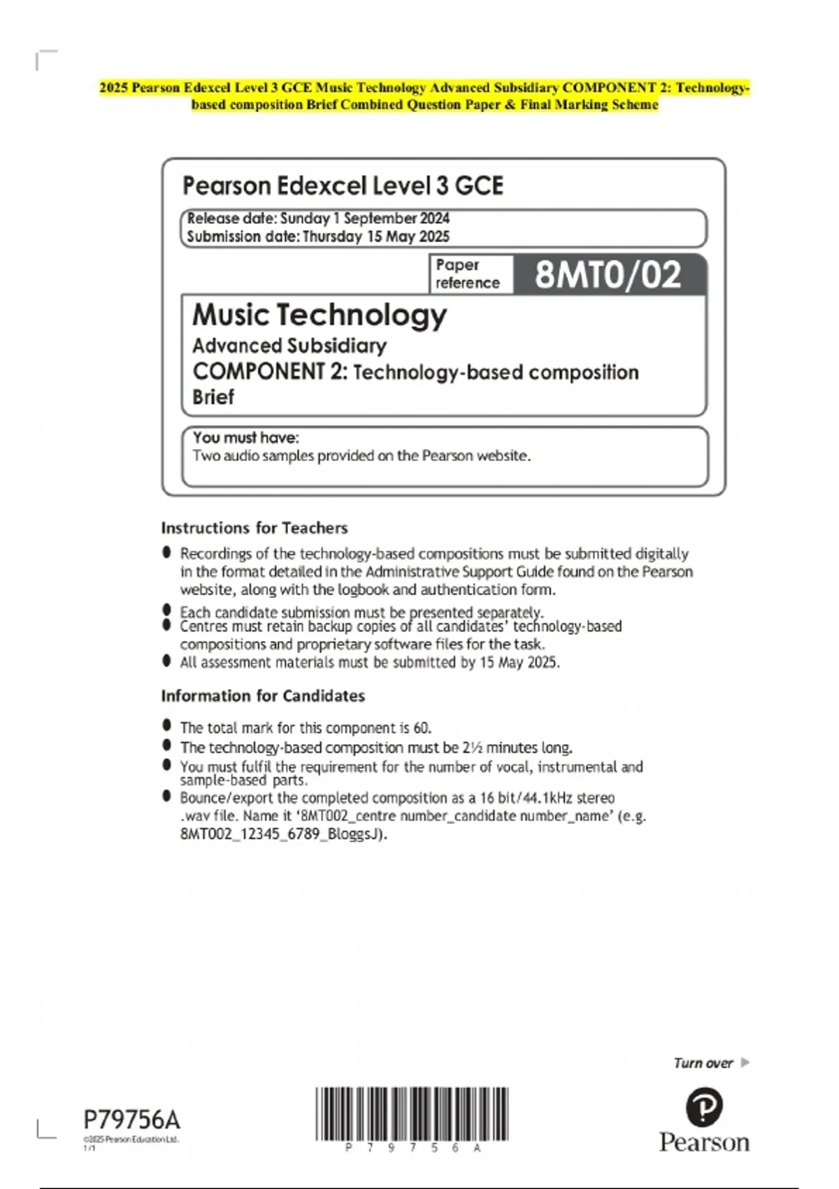 2025 Pearson Edexcel Level 3 GCE Music Technology Advanced Subsidiary COMPONENT 2: Technology based composition Brief Examination Paper and Final Marking Scheme