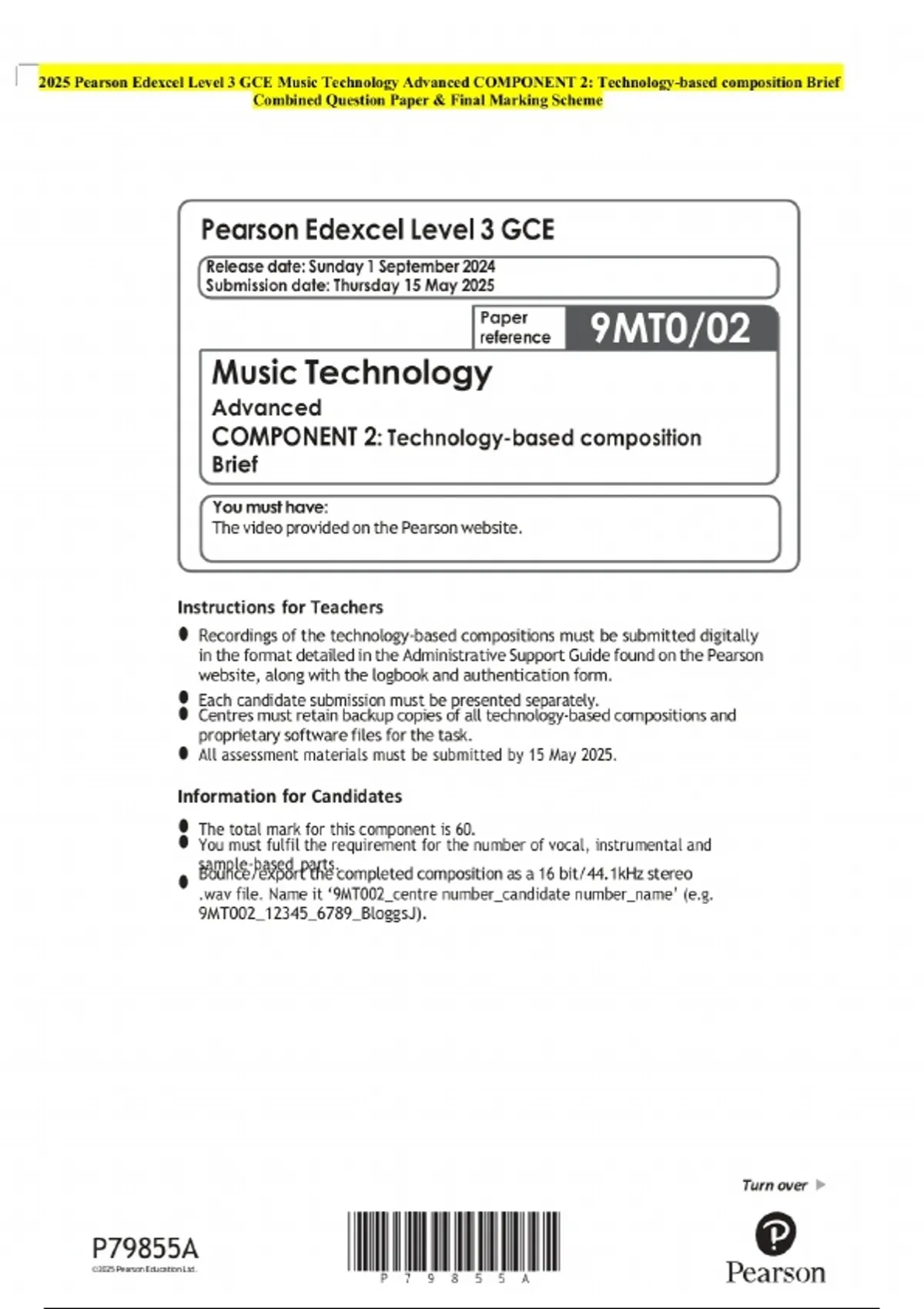 2025 Pearson Edexcel Level 3 GCE Music Technology Advanced COMPONENT 2: Technology-based composition Brief Examination Paper and Final Marking Scheme