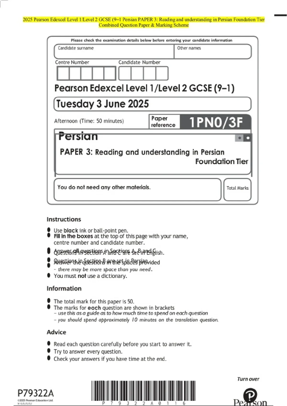2025 Pearson Edexcel Level 1/Level 2 GCSE (9–1 Persian PAPER 3: Reading and understanding in Persian Foundation Tier Examination Paper and Final Marking Scheme