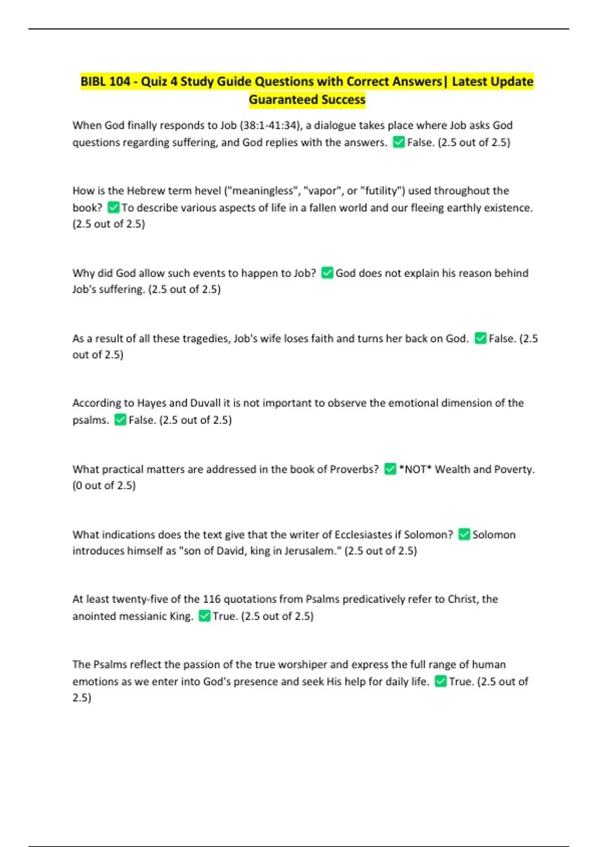 BIBL 104 - Quiz 4 Study Guide Questions with Correct Answers| Latest Update