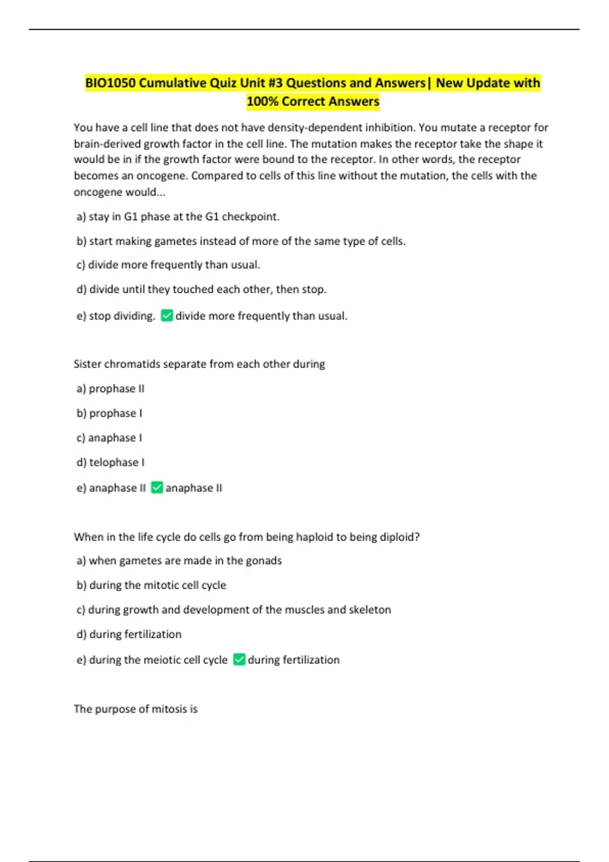 BIO1050 Cumulative Quiz Unit #3 Questions and Answers| New Update with
