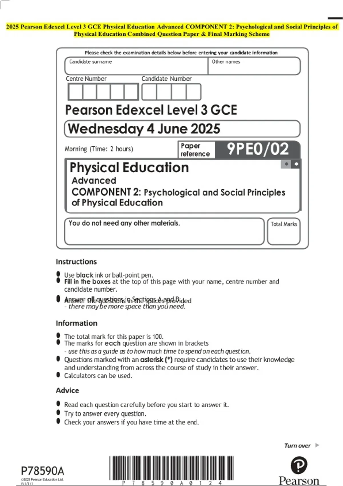 2025 Pearson Edexcel Level 3 GCE Physical Education Advanced COMPONENT 2: Psychological and Social Principles of Physical Education Examination Paper and Final Marking Scheme