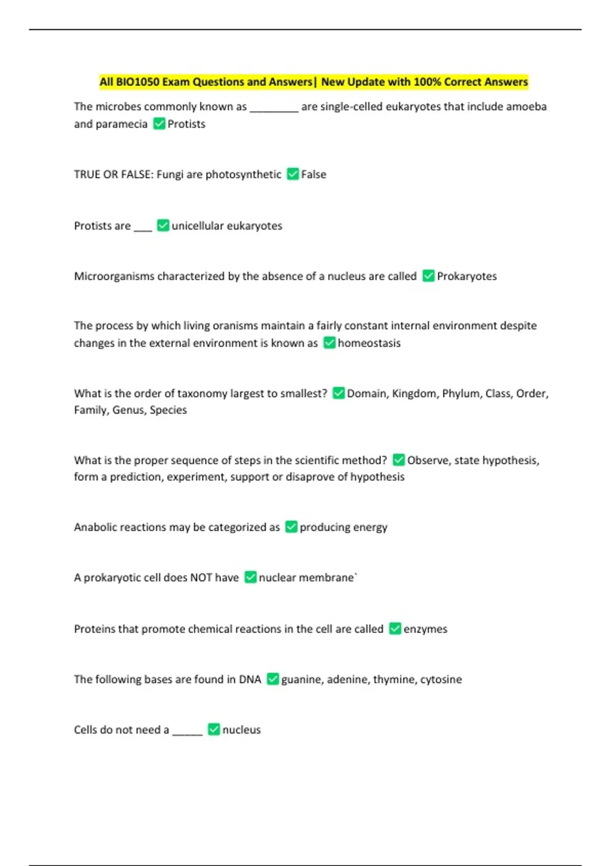All BIO1050 Exam Questions and Answers| New Update with 100% Correct Answers