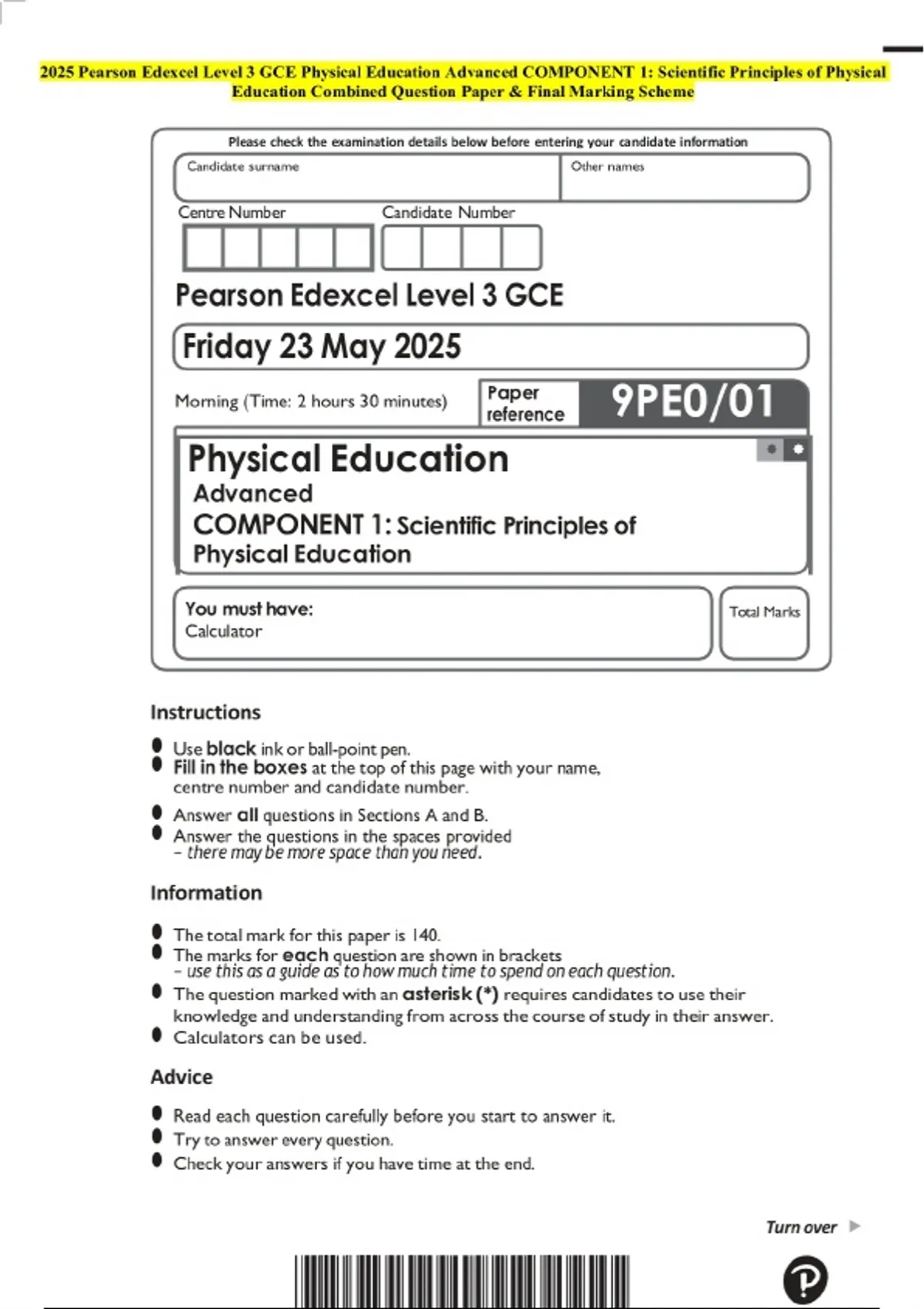 2025 Pearson Edexcel Level 3 GCE Physical Education Advanced COMPONENT 1: Scientific Principles of Physical Education Examination Paper and Final Marking Scheme