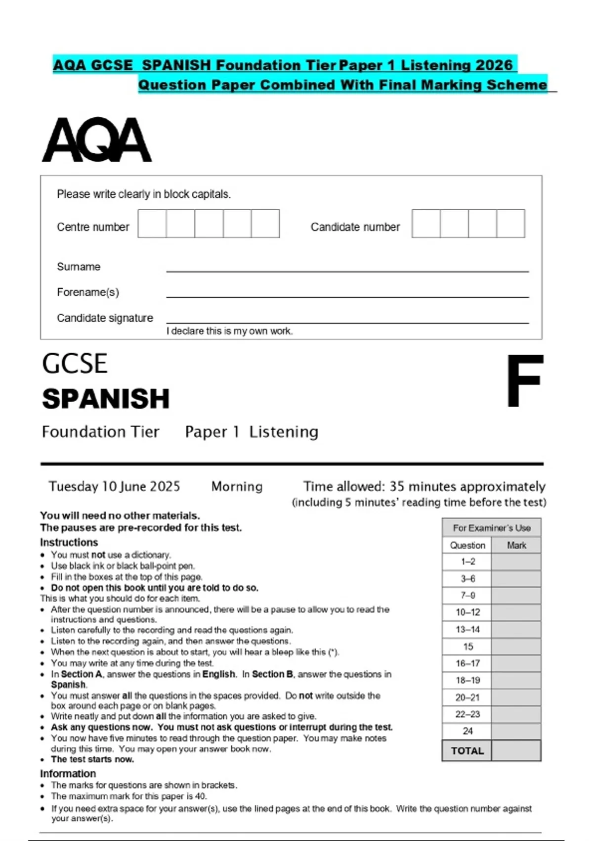 AQA GCSE SPANISH Foundation Tier Paper 1 Listening 2026 Question Paper Combined With Final Marking Scheme