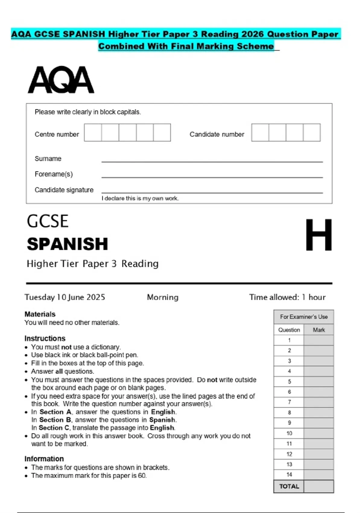 AQA GCSE SPANISH Higher Tier Paper 3 Reading 2026 Question Paper Combined With Final Marking Scheme