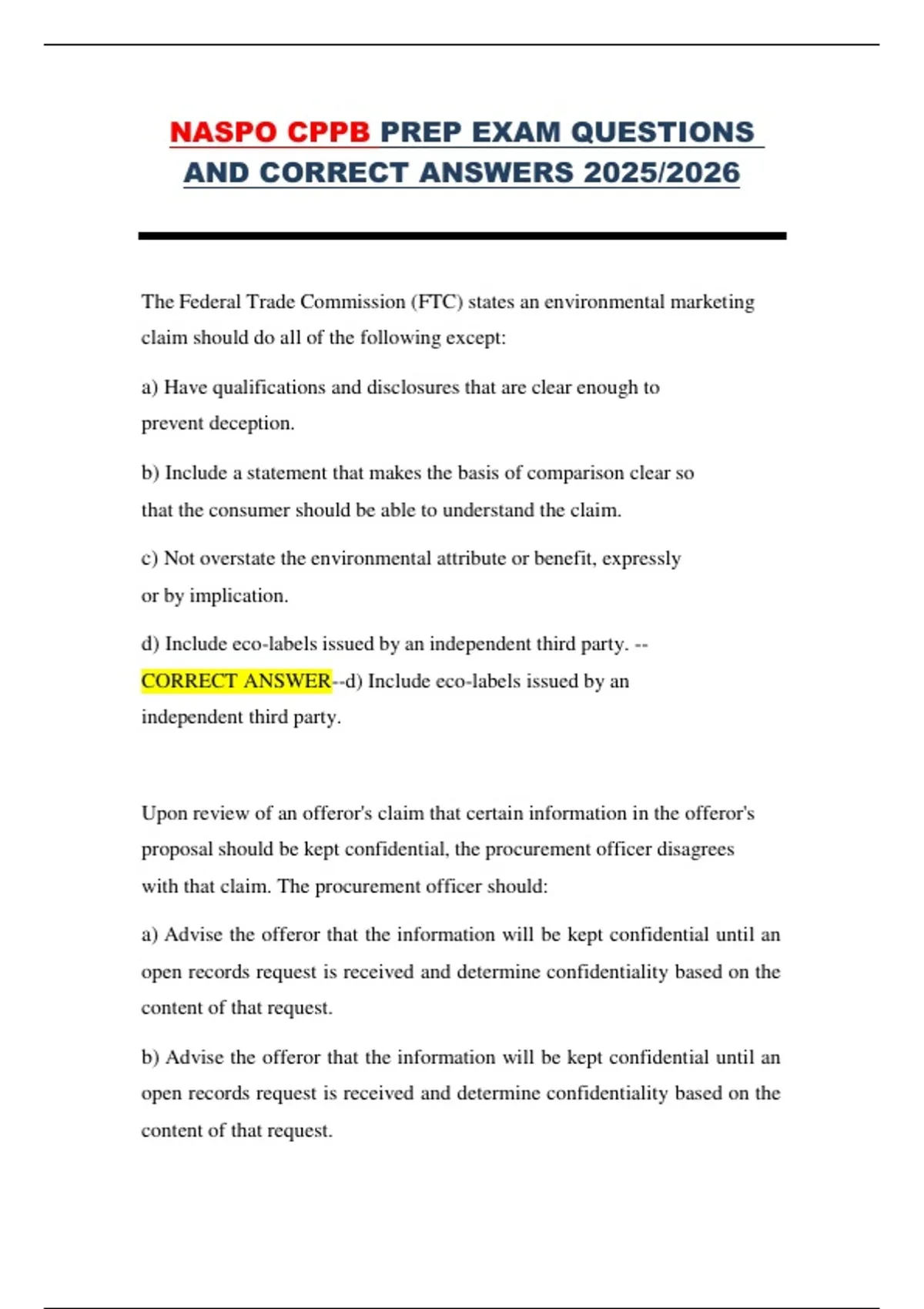 This document contains an extensive collection of NASPO CPPB-style exam questions with clearly indicated correct answers, covering core public procurement principles, laws, contract management, negotiation, ethics, and strategic procurement. It is designed as a comprehensive practice and review resource aligned with the Certified Public Procurement Buyer (CPPB) exam for the 2025–2026 testing cycle.