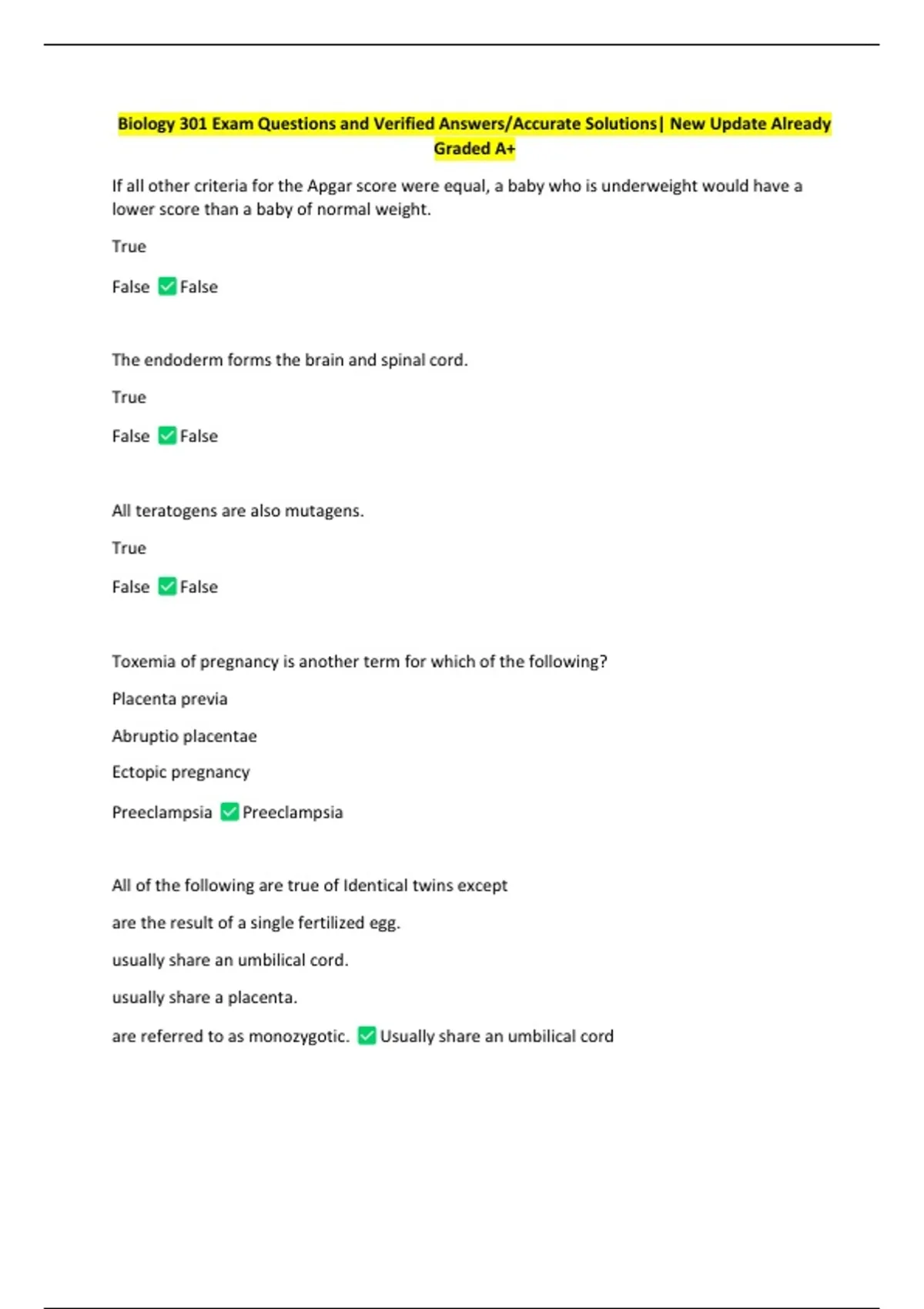 Biology 301 Exam Questions and Verified Answers/Accurate Solutions| New Update Already