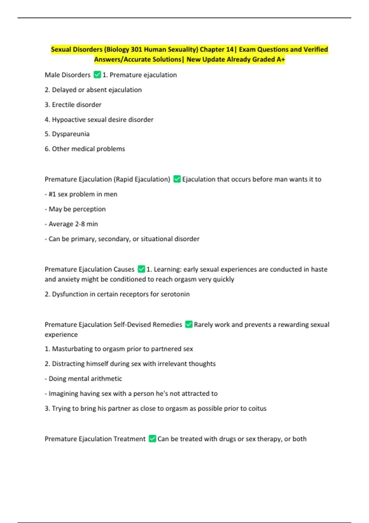 Sexual Disorders (Biology 301 Human Sexuality) Chapter 14| Exam Questions and Verified