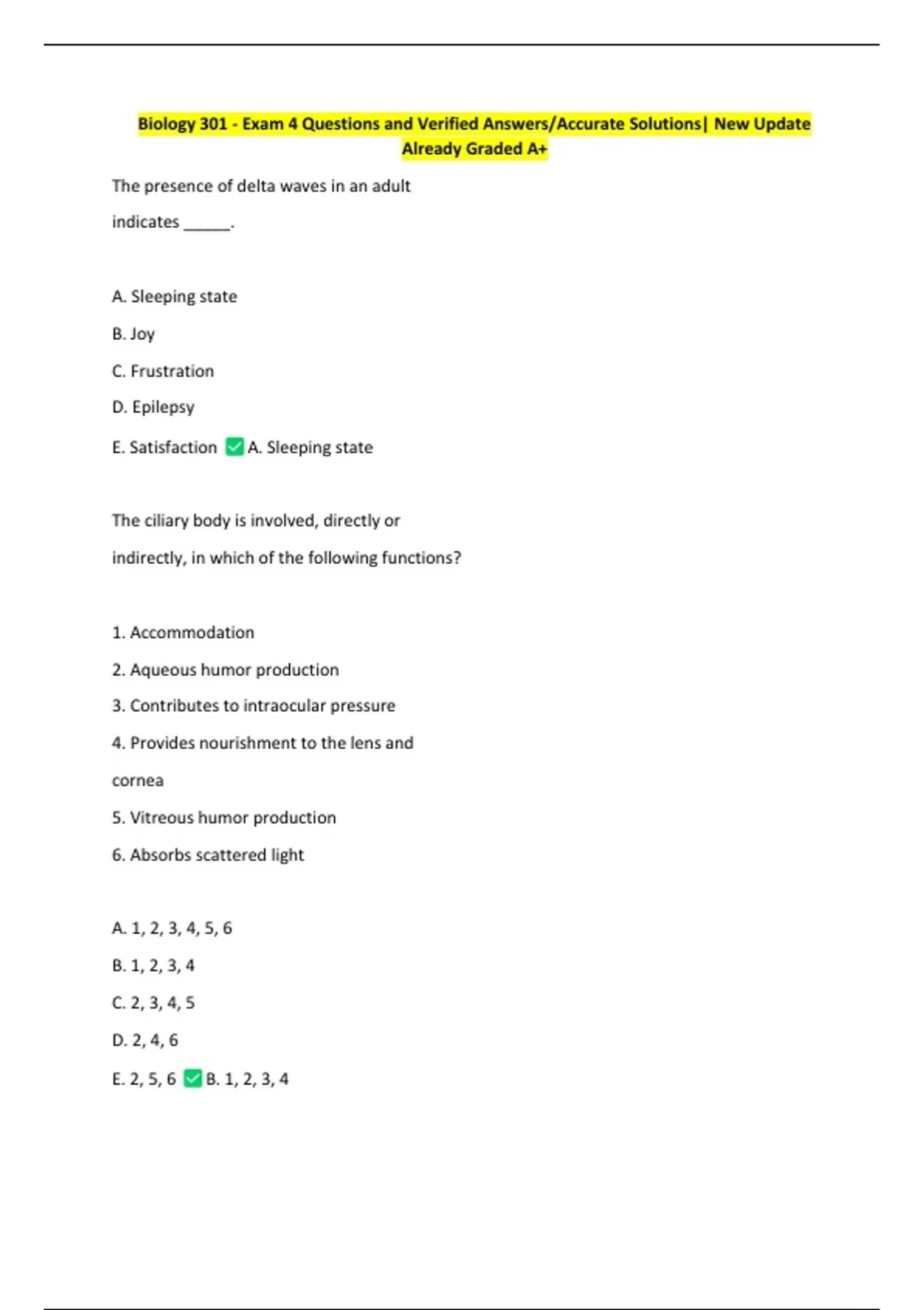 Biology 301 - Exam 4 Questions and Verified Answers/Accurate Solutions| New Update