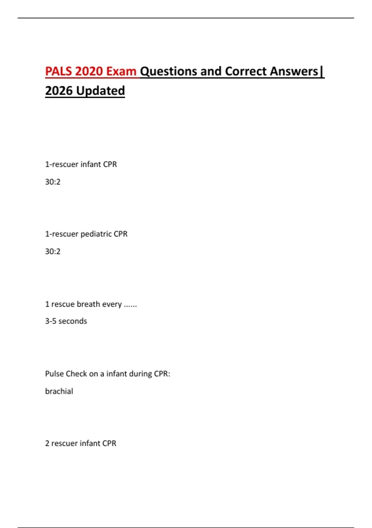 This document is an updated PALS 2020 exam study guide containing comprehensive exam questions with correct, verified answers covering pediatric emergency assessment and resuscitation concepts. It includes CPR ratios for infants and children, respiratory and cardiac assessment, Pediatric Assessment Triangle (PAT), TICLS, airway management, oxygen delivery, shock and respiratory failure recognition, arrhythmias, medications, defibrillation energy, and team dynamics. The content is organized in a clear question-and-answer format to support focused review and preparation for the PALS exam.
