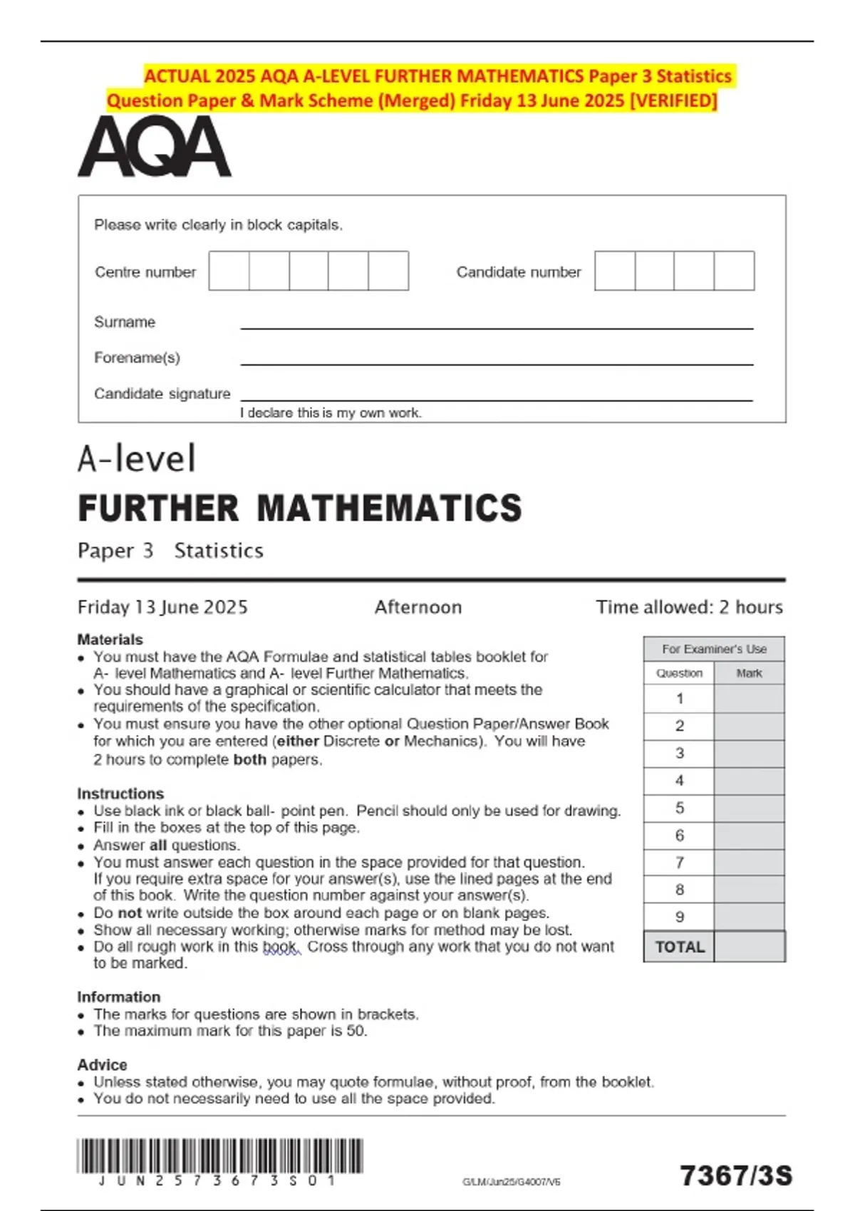 ACTUAL 2025 AQA A-LEVEL FURTHER MATHEMATICS Paper 3 Statistics Question Paper & Mark Scheme (Merged) Friday 13 June 2025 [VERIFIED]