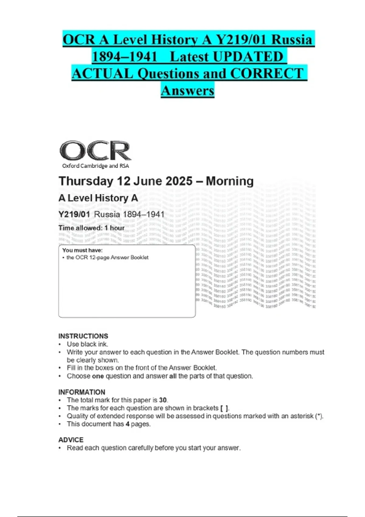 OCR A Level History A Y219/01 Russia 1894–1941 Latest UPDATED ACTUAL Questions and CORRECT Answers