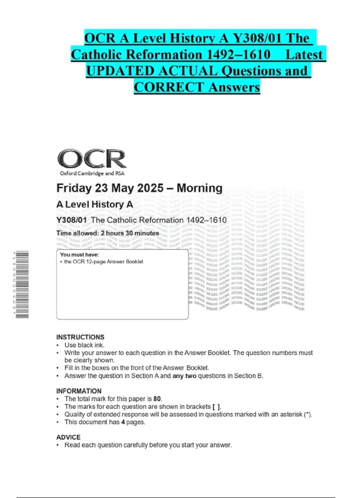 OCR A Level History A Y308/01 The Catholic Reformation 1492–1610 Latest UPDATED ACTUAL Questions and CORRECT Answers