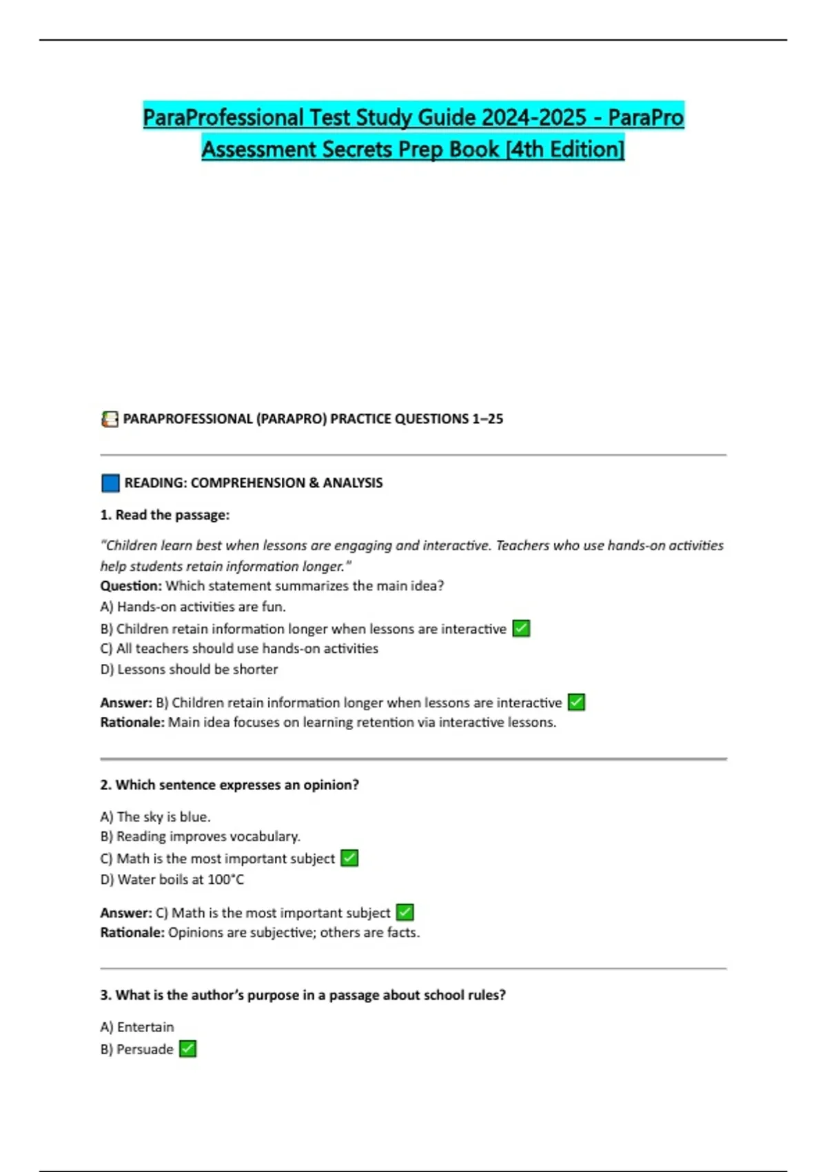 PARAPROFESSIONAL (PARAPRO) PRACTICE QUESTIONS 1–25