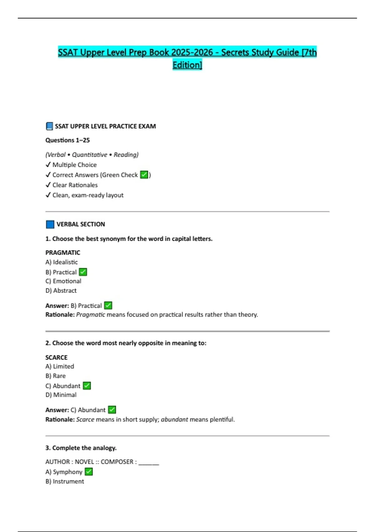 SSAT Upper Level Prep Book - Secrets Study Guide -7th Edition- Exam Questions And Verified Solutions With Rationales.