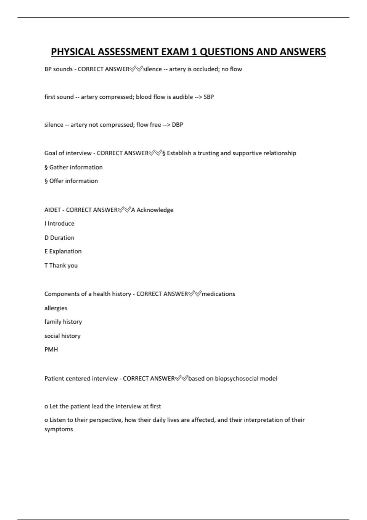 PHYSICAL ASSESSMENT EXAM 1 QUESTIONS AND ANSWERS