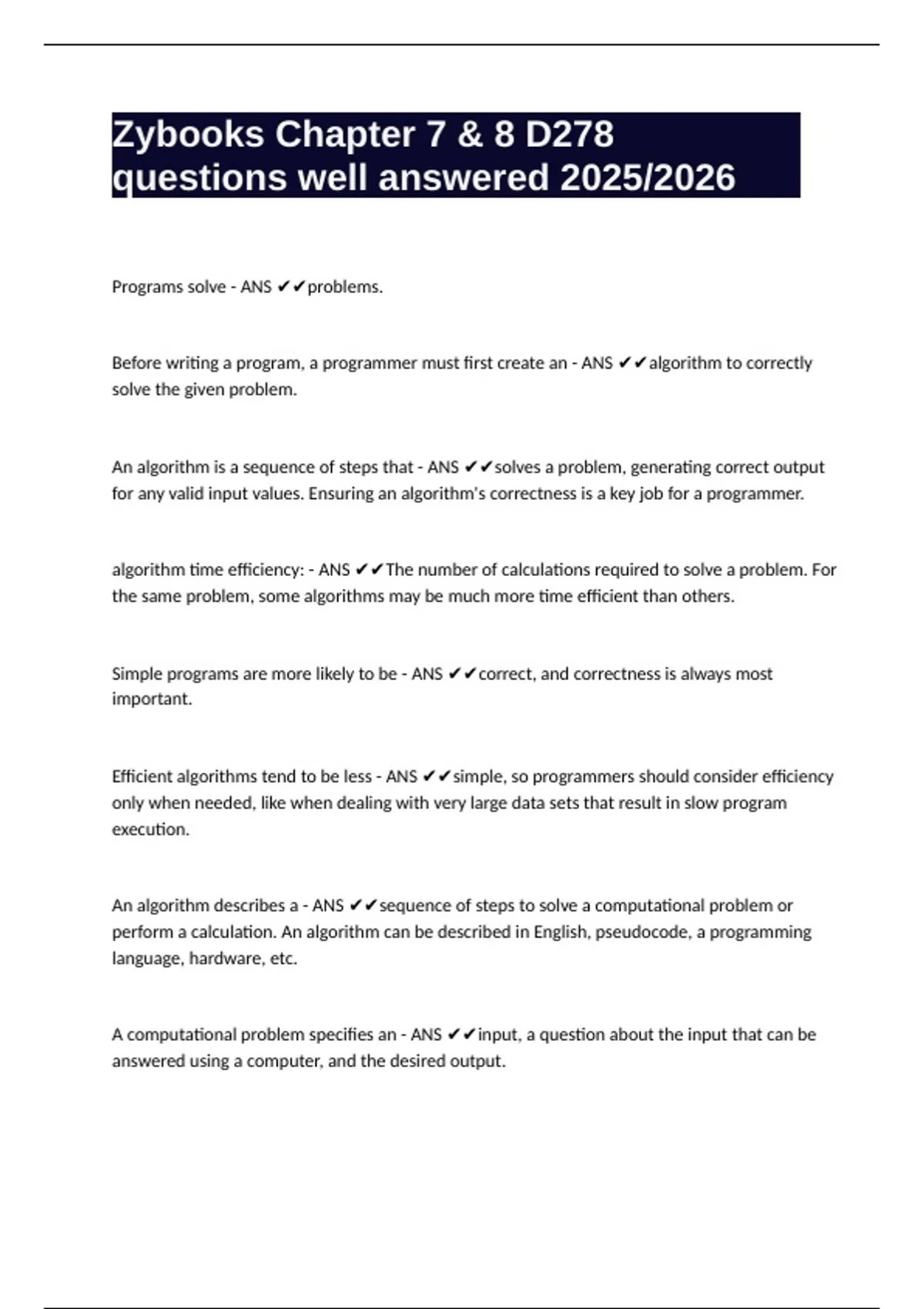 An algorithm is a sequence of steps that - ANS ✔✔solves a problem, generating correct output
