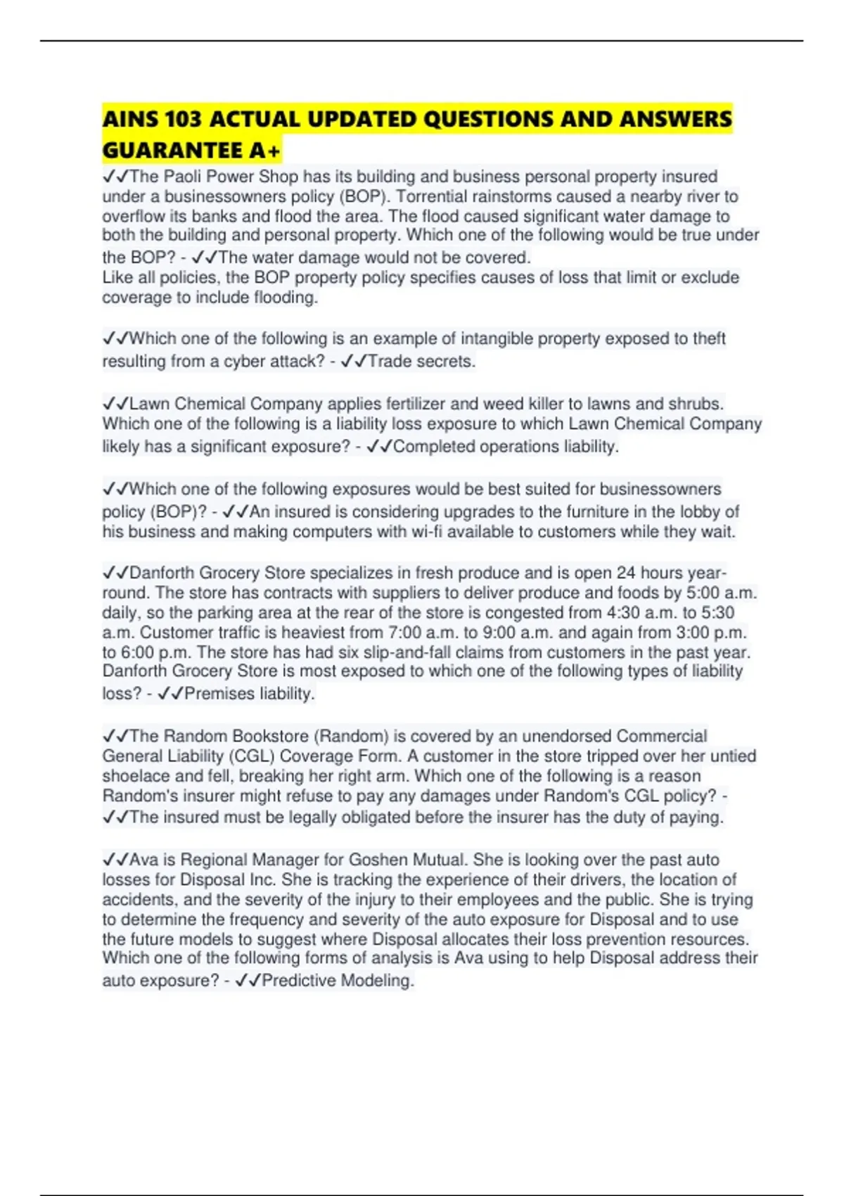 ✔✔Which one of the following exposures would be best suited for businessowners