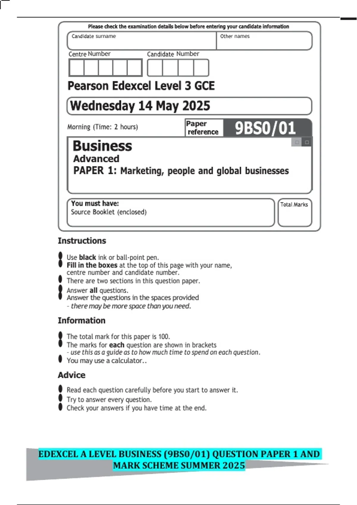 EDEXCEL A LEVEL BUSINESS (9BS0/01) QUESTION PAPER 1 AND