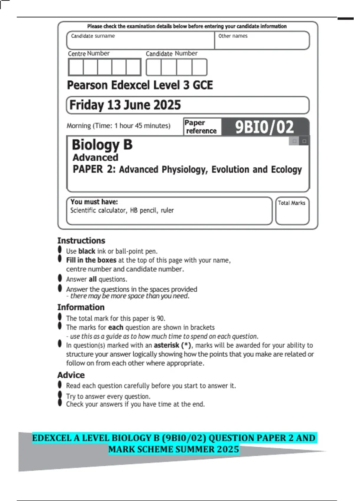 EDEXCEL A LEVEL BIOLOGY B (9BI0/02) QUESTION PAPER 2 AND
