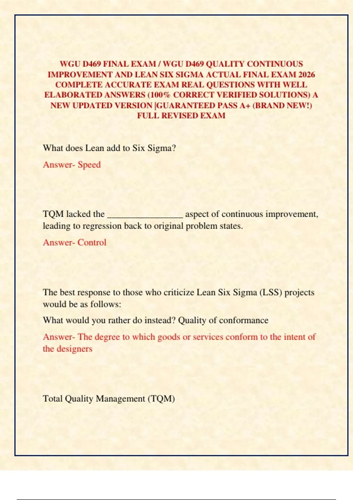 IMPROVEMENT AND LEAN SIX SIGMA ACTUAL FINAL EXAM 2026