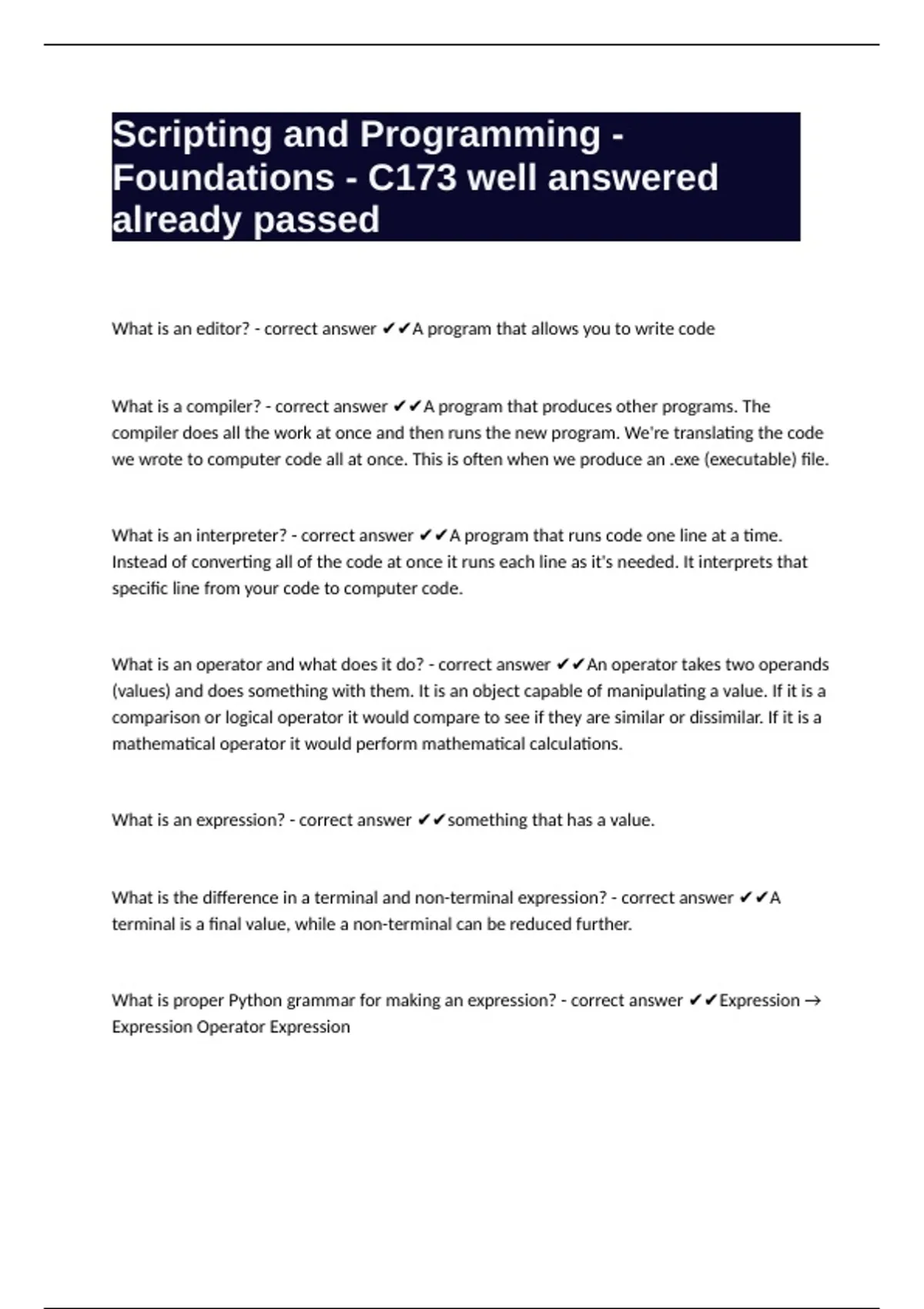 What is an interpreter? - correct answer ✔✔A program that runs code one line at a time.
