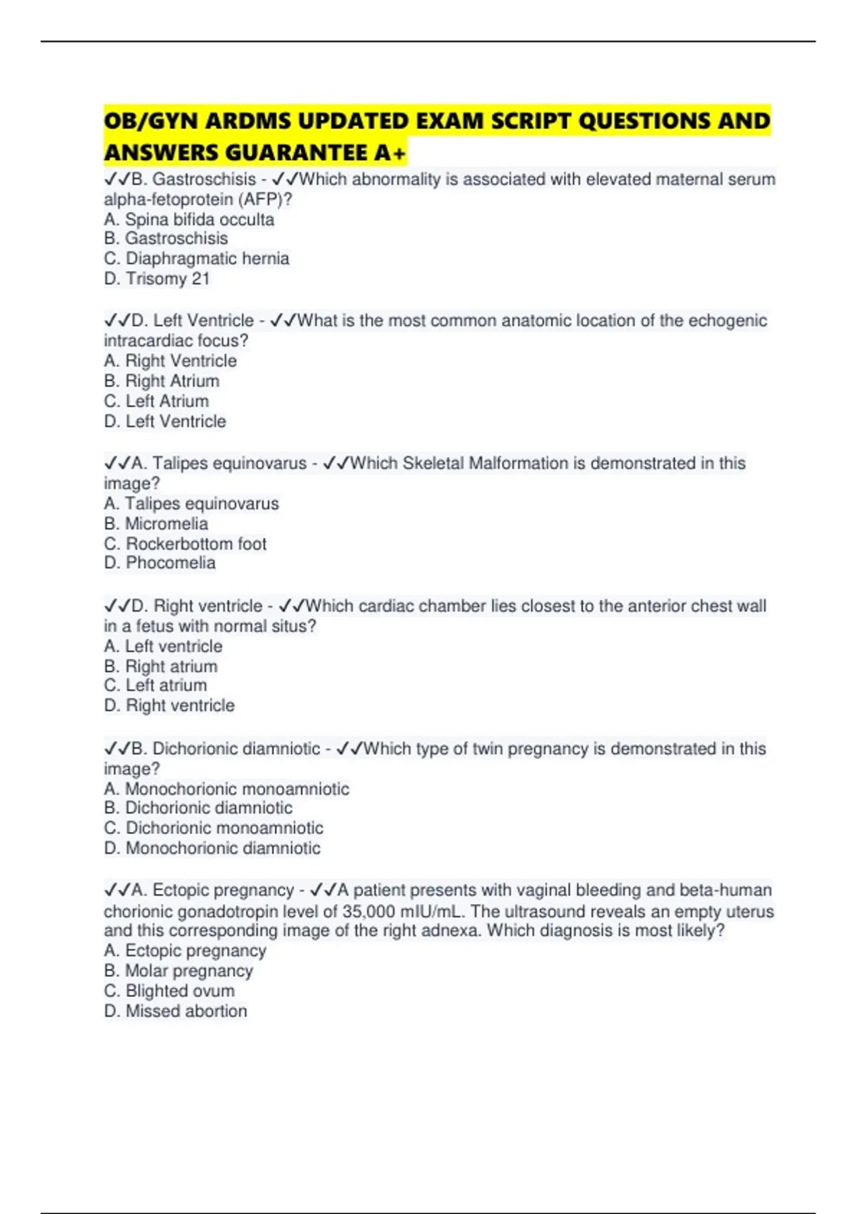 OB/GYN ARDMS UPDATED EXAM SCRIPT QUESTIONS AND ANSWERS GUARANTEE A+