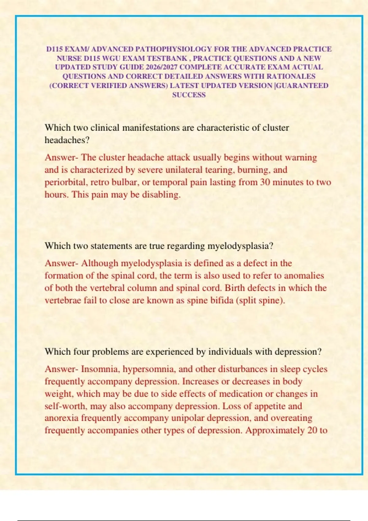 D115 EXAM/ ADVANCED PATHOPHYSIOLOGY FOR THE ADVANCED PRACTICE NURSE D115 WGU EXAM TESTBANK , PRACTICE QUESTIONS AND A NEW UPDATED STUDY GUIDE 2026/2027 COMPLETE ACCURATE EXAM ACTUAL QUESTIONS AND CORRECT DETAILED ANSWERS WITH RATIONALES (CORRECT VERIFIED ANSWERS) LATEST UPDATED VERSION |GUARANTEED SUCCESS