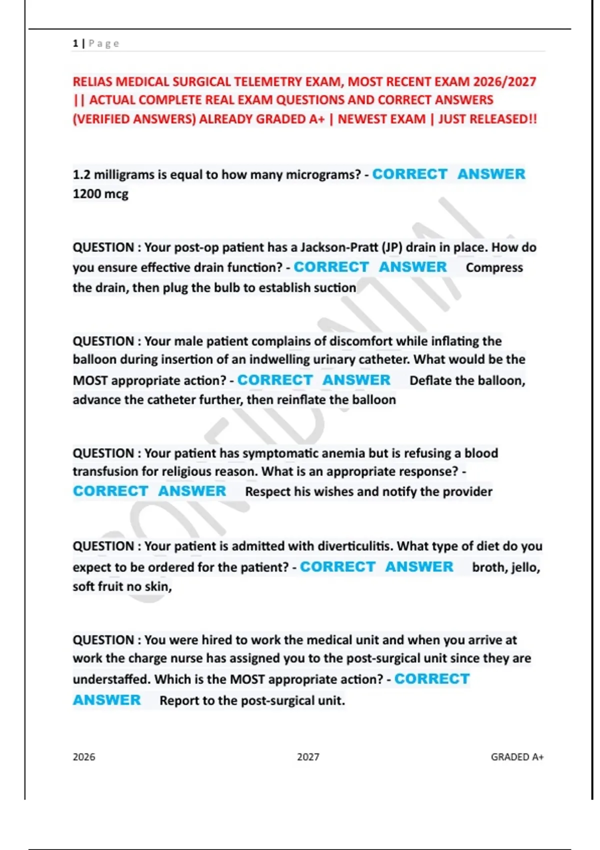 RELIAS MEDICAL SURGICAL TELEMETRY EXAM, MOST RECENT EXAM 2026/2027